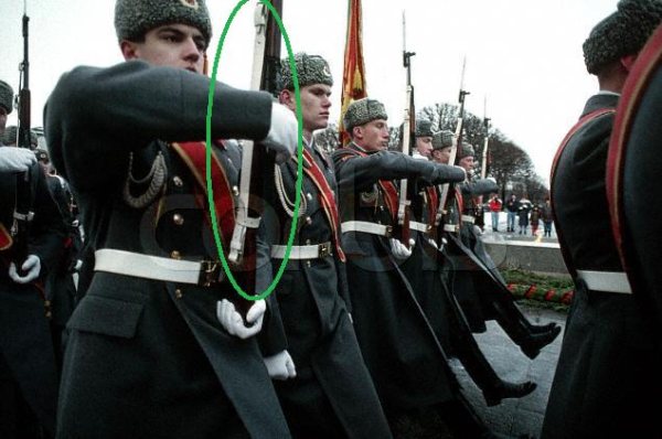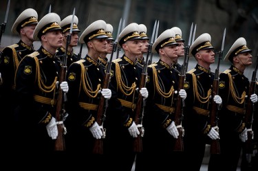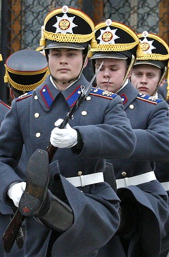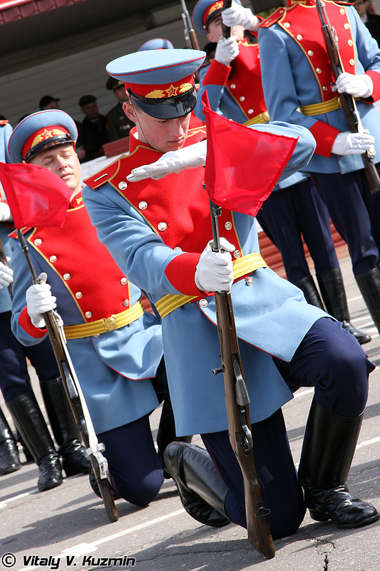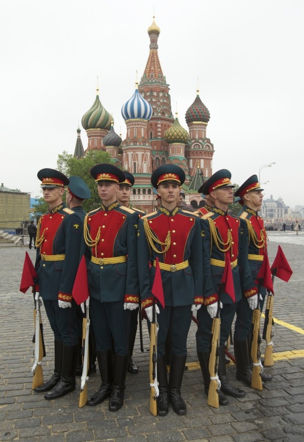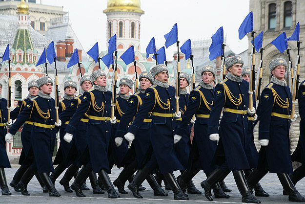 Russian Army honor guards in their 2008 pattern enlisted honor guard dress uniforms on Red Square.