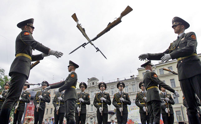Honor guards toss their rifles in the air during Day of Russia observances in downtown St. Petersburg.