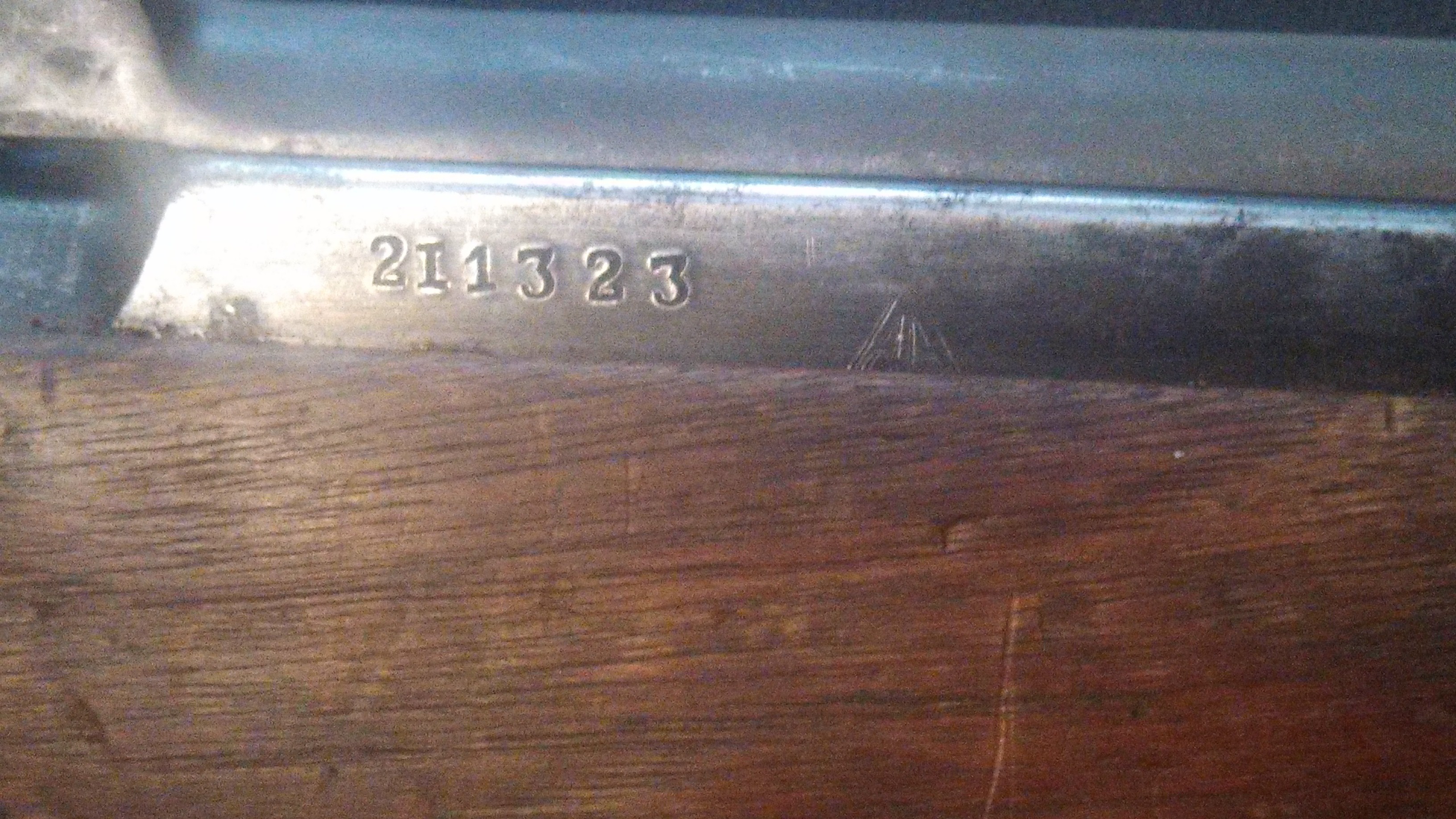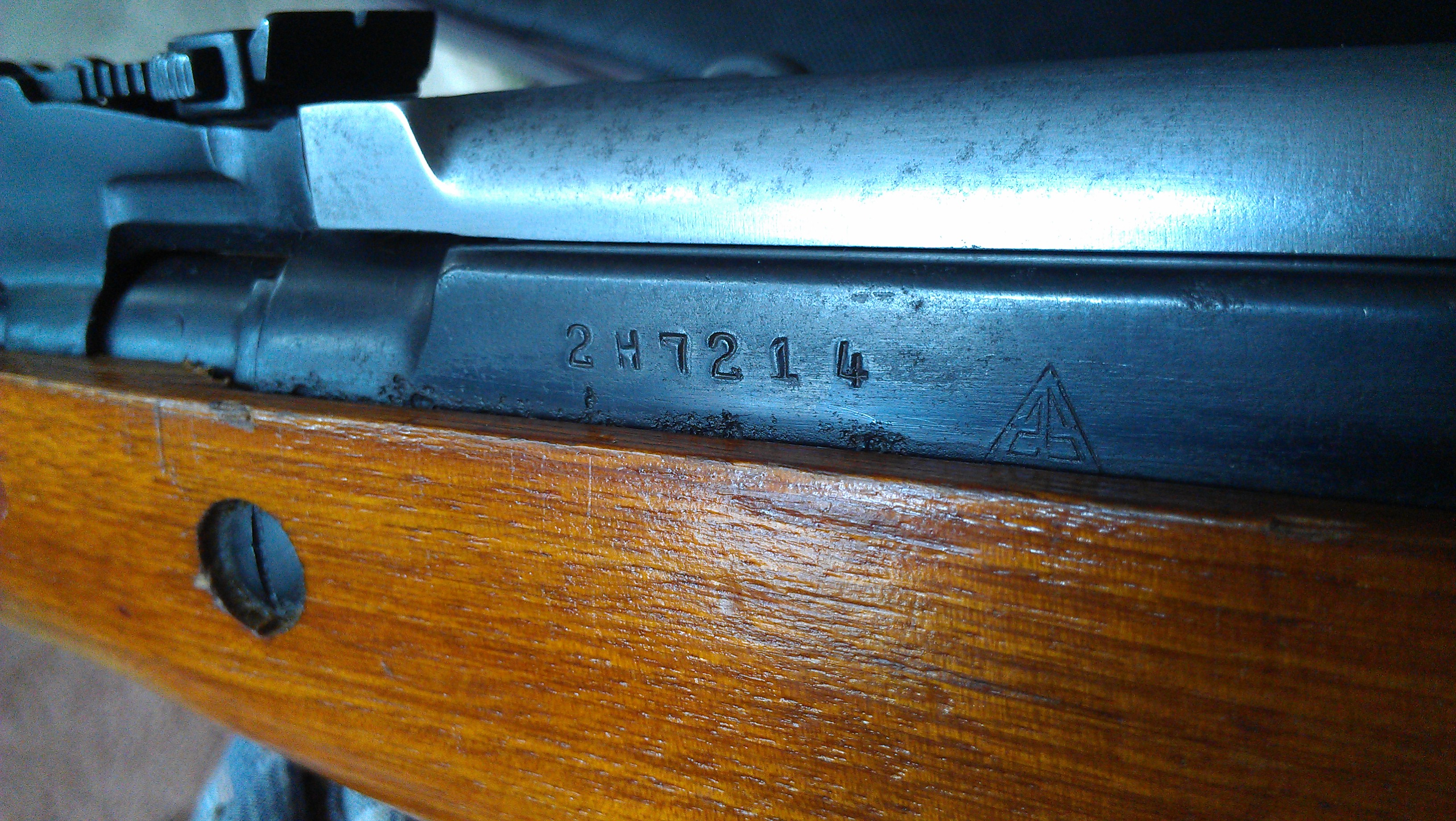 SECTION 36: In this section I will try to show the pictures of the Sino Soviet SKS. The Sino-Soviet is considered to be the first run of SKS's made in China at the Jianshe Arsenal 296 designated by the arsenal marking 26 within a triangle /26\. The factory 26 stamp was first applied on the receiver to the rear (right) of the serial number. Some guns went through without the Arsenal stamping and some used Russian Receivers, not many, but some. The Sino-Soviets had a letter prefix to a 4 digit number. There are also rifles with a number prefix to the letter indicating a second run. These guns were produced in 1956, hence the Type 56 Chinese SKS. Also produced in 1956 were guns with a serial number up to 1 million. These were produced by the Chinese and started their serial numbering sequence. Some collectors consider any first year Chinese SKS a Sino-Soviet, I consider the ones with a letter to be the true Sino-Soviet. The pot belly stocks of these early lettered Sino's were also unique. They had the same finish color of the Russian Artic Birch stocks. They had a side sling swivel with the serial number and inspector cartouche to the rear of the swivel. There was a star stamp on the right rear off the butt stock. The finish on these guns rivaled that of the Russian made SKS's. Many of these guns were imported by CJA in Southfield, Michigan. The only purpose of this page is to help make the collector aware that differences do occur and about anything could be possible. These are ALL from my personal observations and not from any books. Photos courtesy of MANY.
